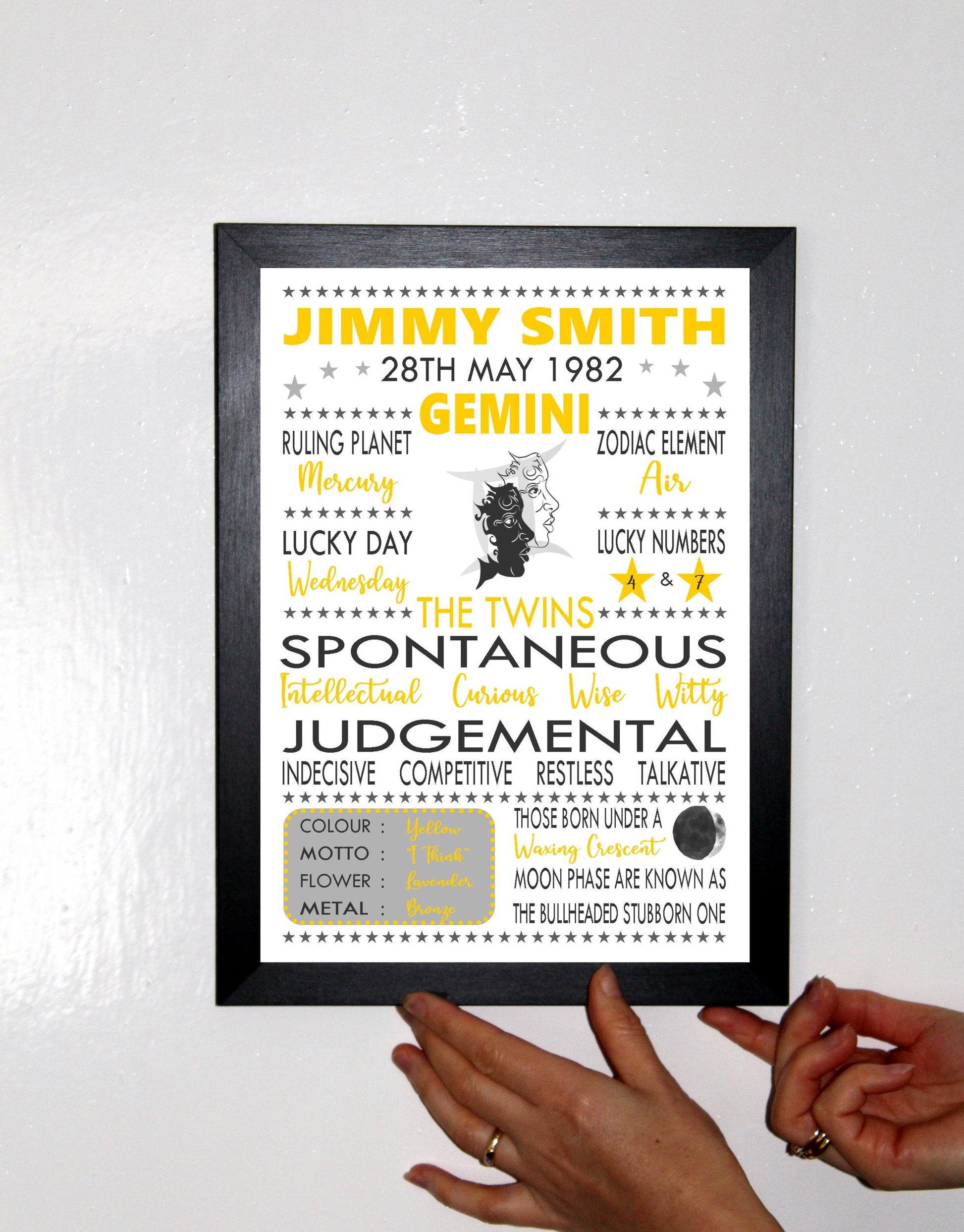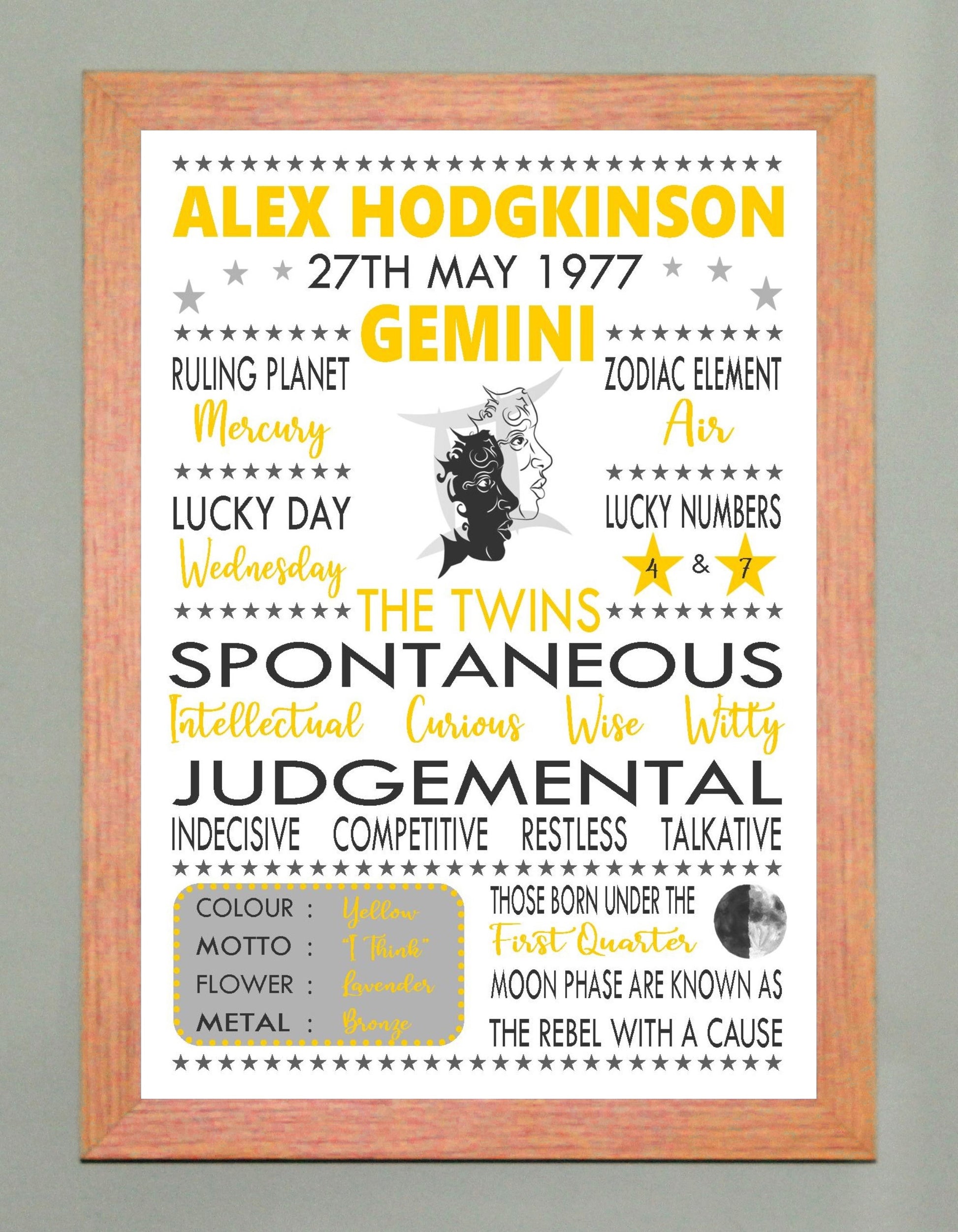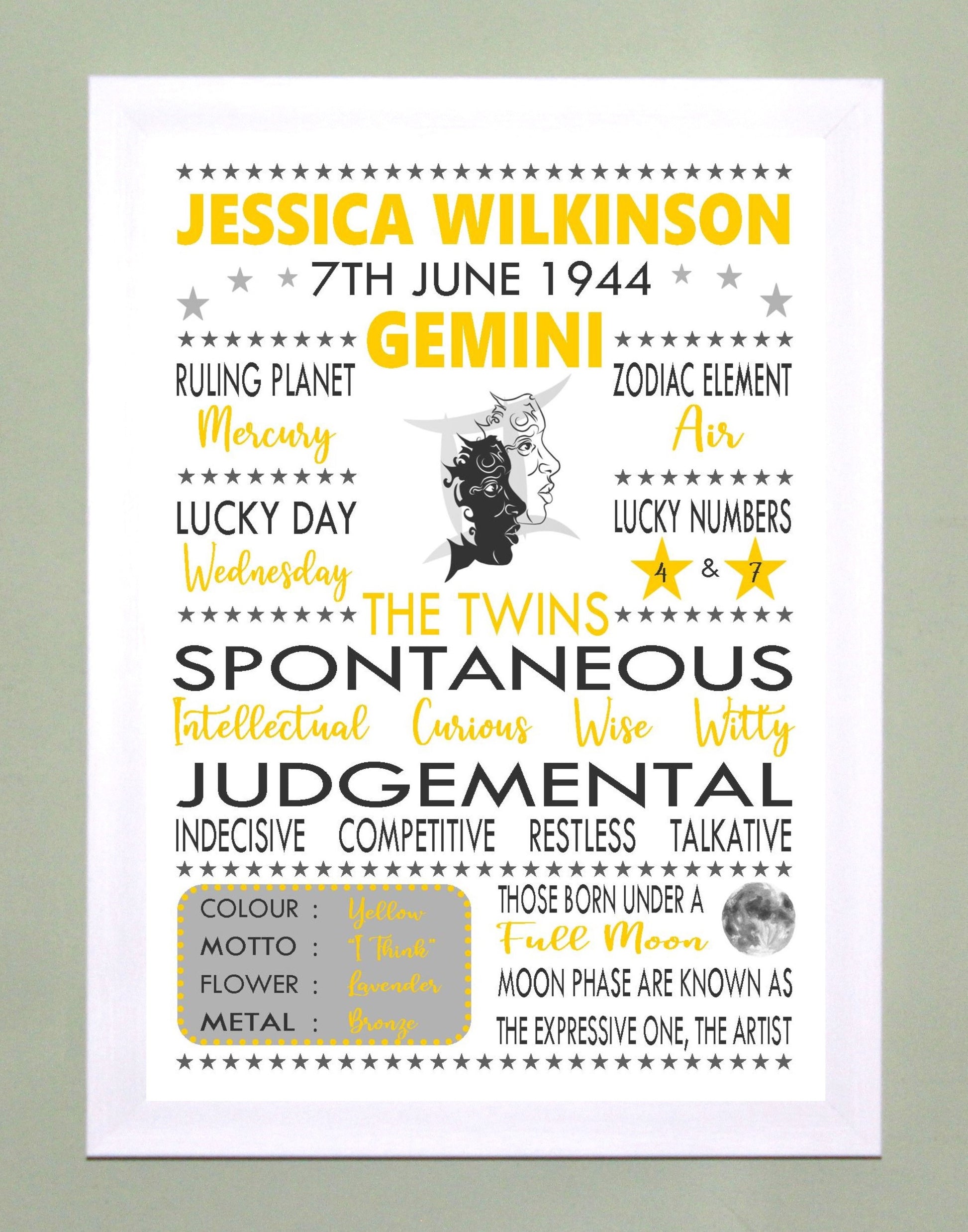 "Personalised Gemini" Star Sign Zodiac Birthday Horoscope A4 Yellow Print / Poster Sold as the Print gift on its own or in a choice of frame. Personalised with the name, date of birth and moon phase at birth.