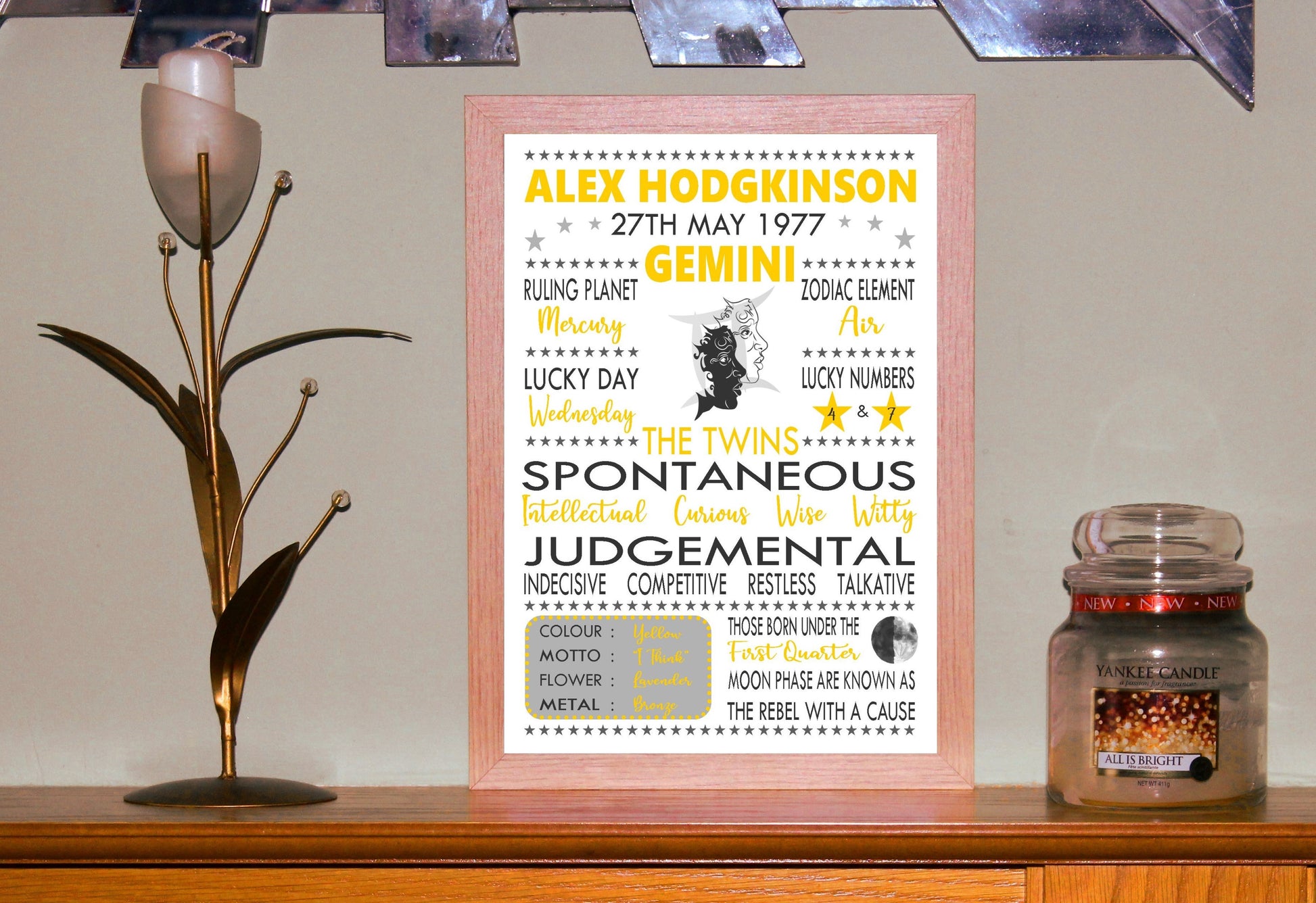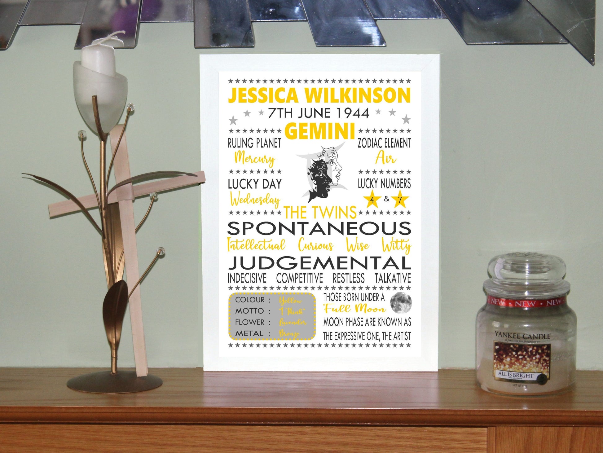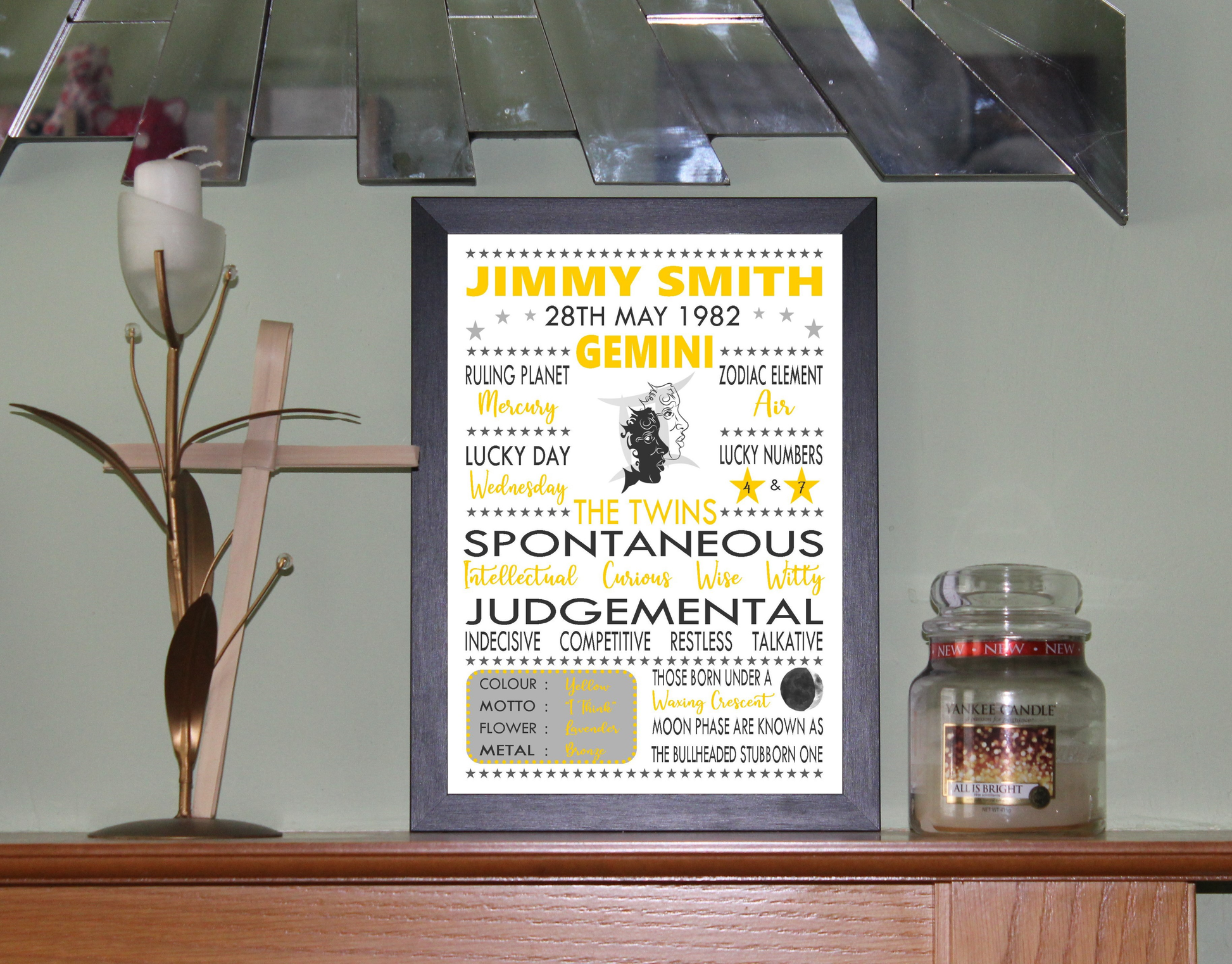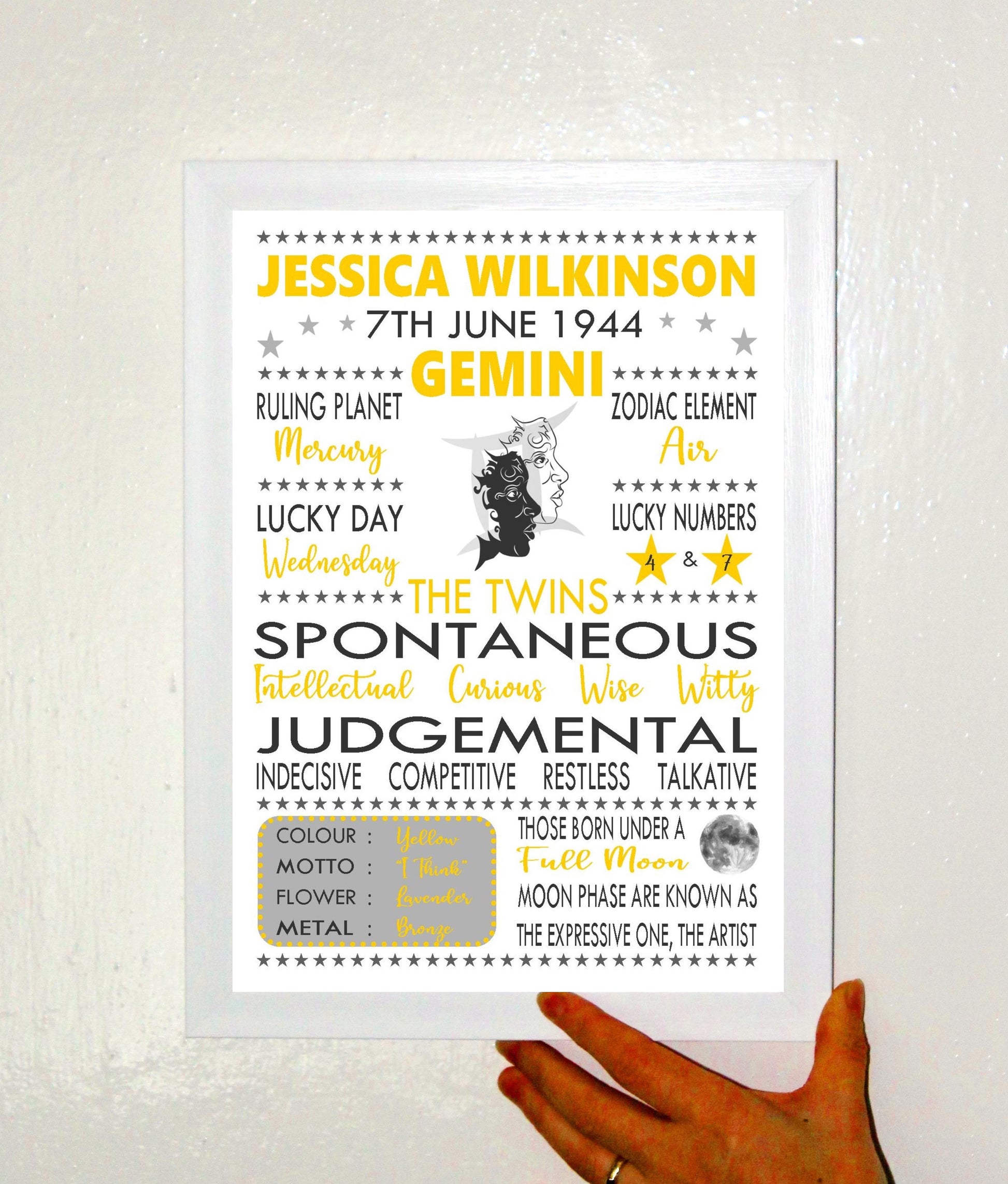 "Personalised Gemini" Star Sign Zodiac Birthday Horoscope A4 Yellow Print / Poster Sold as the Print gift on its own or in a choice of frame. Personalised with the name, date of birth and moon phase at birth.